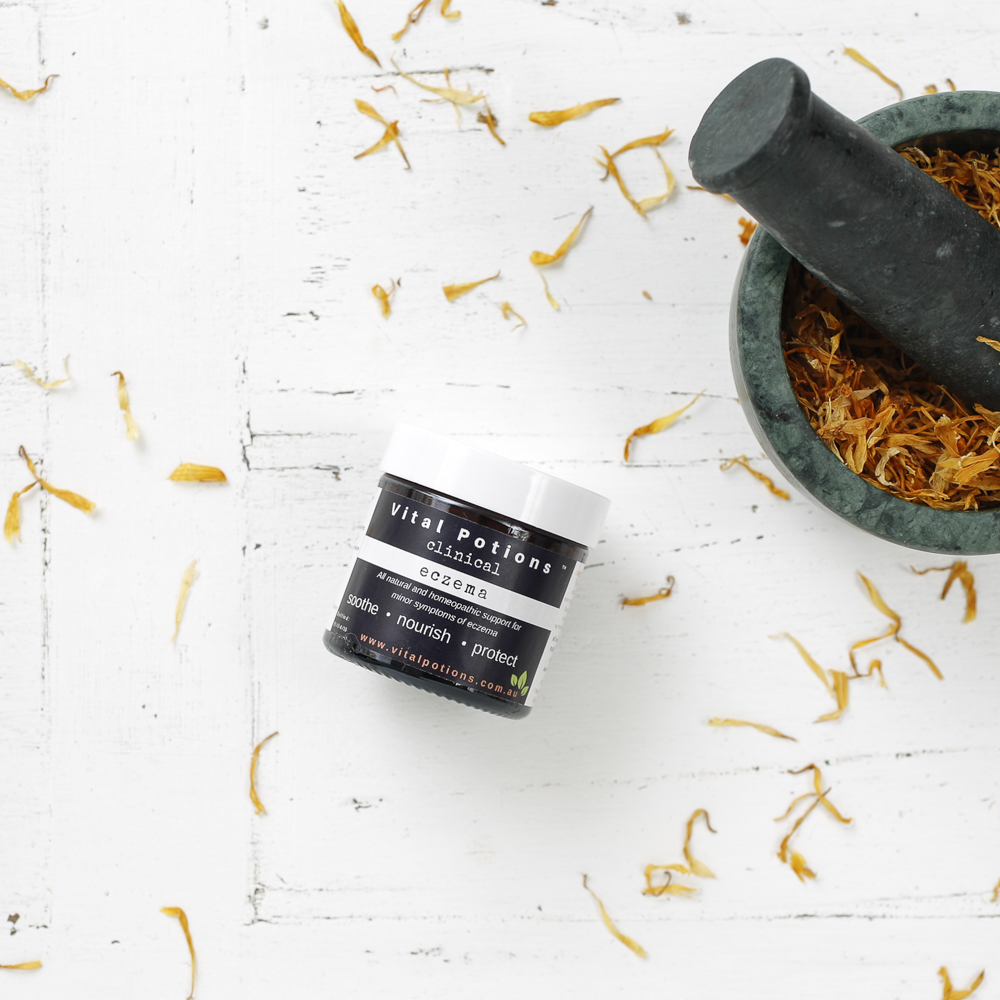 These herbs have traditionally been used to soothe the irritating condition of eczema. Apply as needed to the affected area to help soothe the skin. It is always best to address any internal issues that may be contributing to your skin issues as if the skin is irritated, the internal usually will be as well.
